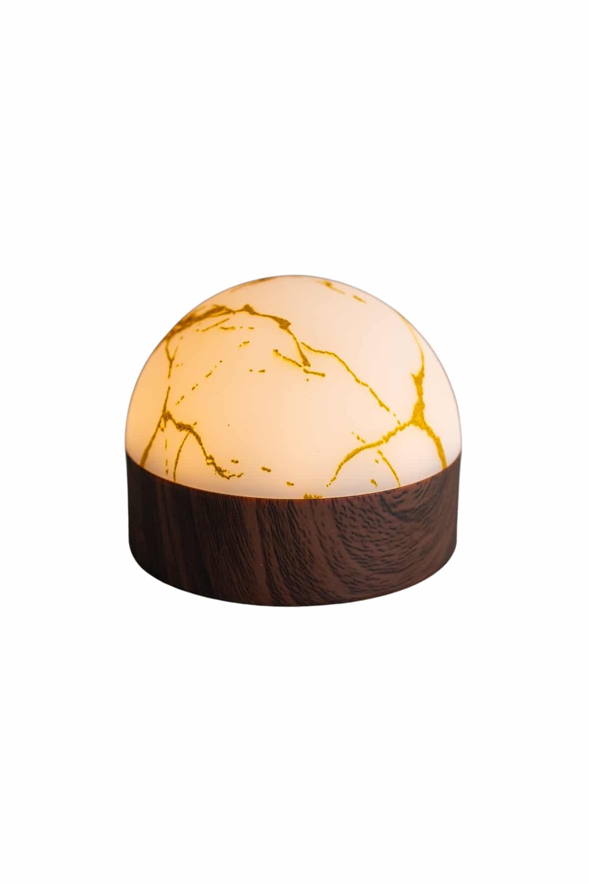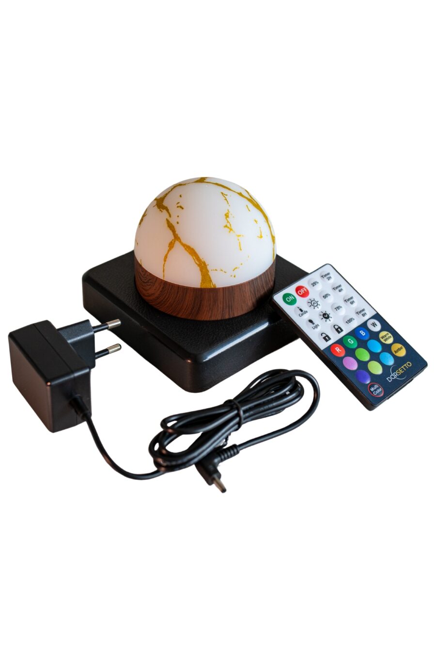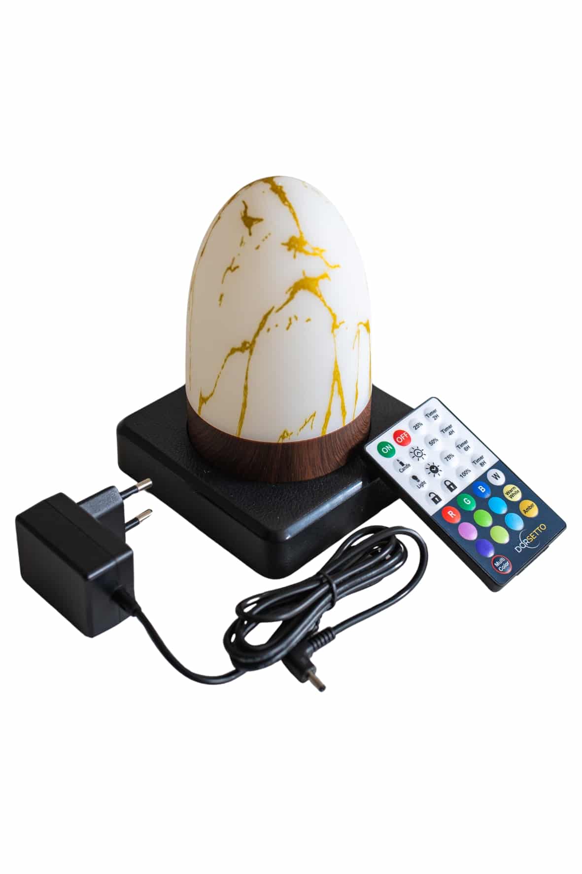 Twee marmeren gouden ovale oplaadbare led tafellampen (waterdicht, timerfunctie) met houten voet rusten op een zwart oplaadplateau, vergezeld van een afstandsbediening en voedingsadapter met kabel.