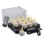 De lichtjes worden opgeladen in een magnetische oplaadbox. Hiermee laadt u alle theelichtjes tegelijk veilig en netjes op. Na een oplaadtijd van 3,5 uur branden de led theelichtjes tot wel 400 uur per laadbeurt, afhankelijk van de helderheid.