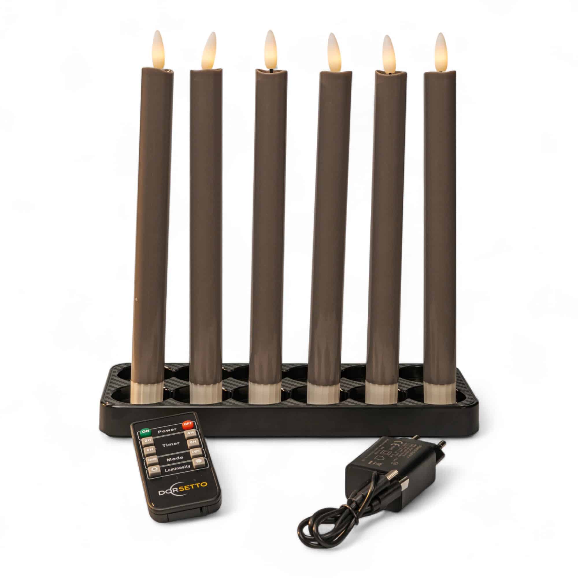Zes led dinerkaarsen donker grijs (set van 6) staan in een zwarte rechthoekige voet, met een afstandsbediening en voedingsadapter ervoor. Deze oplaadbare kaarsen hebben een brandduur tot 400 uur en worden weergegeven op een witte achtergrond.
