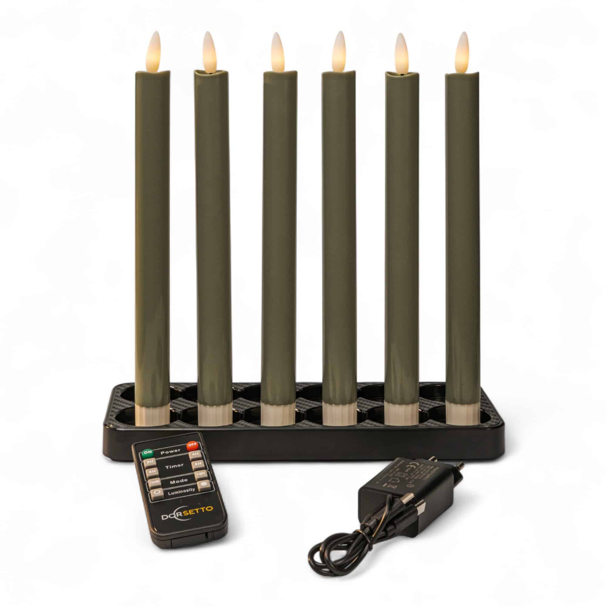 Dinerkaarsen LED olijfgroen 250 mm – oplaadbaar, tot 400 uur brandduur, set van 6
