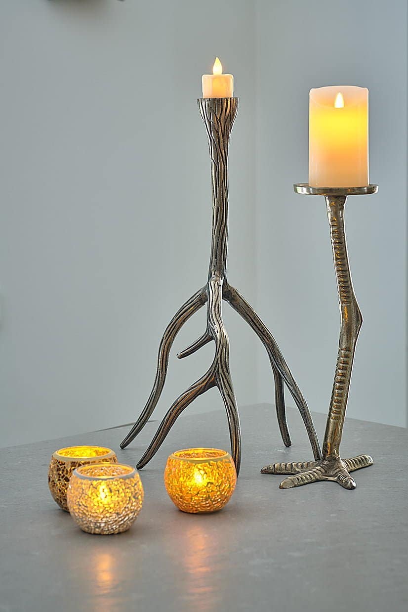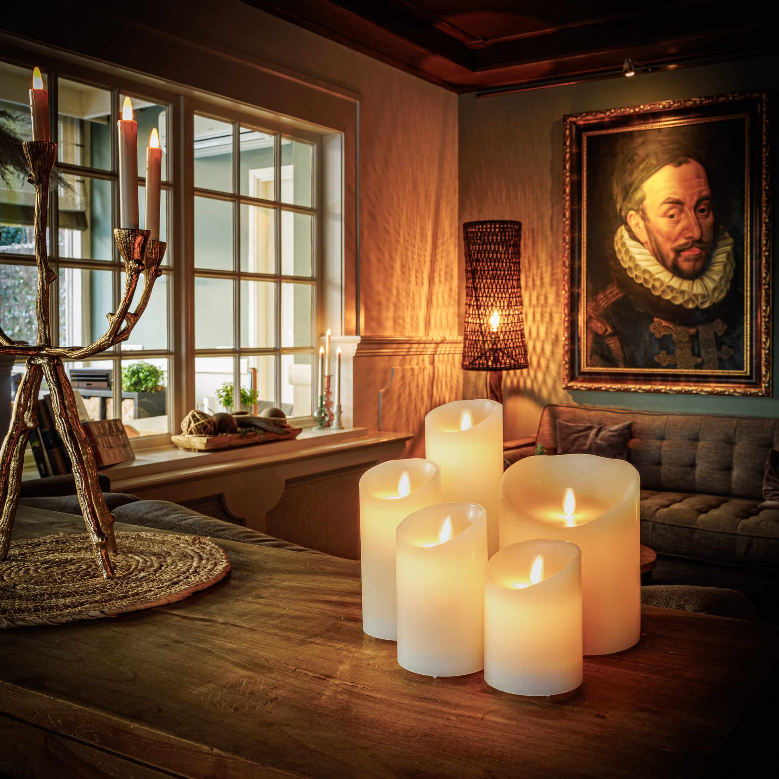 Een gezellige woonkamer met LED-kaarsen die gloeien op een houten tafel, een kandelaar, een bank, een groot raam en een portret van een man in historische kleding aan de warm verlichte muur.